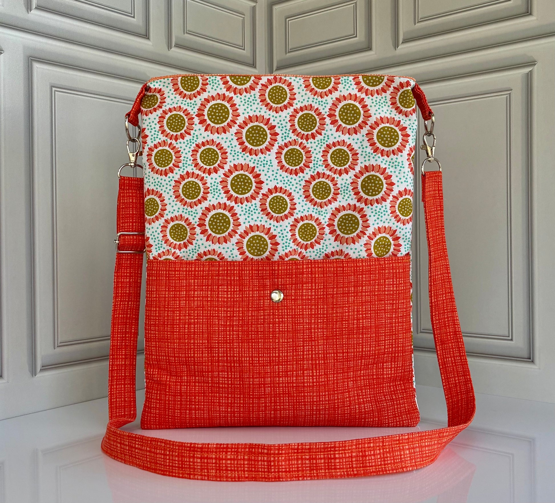Pretty Sunflowers swim through a delicate light blue polka dot background on soft cotton exterior. Lined with a bright coordinating dark and light orange fabric. Lightly padded exterior for softness and shape. External pocket features magnetic snap closure. Lightweight and durable, with a flat profile, this crossbody comfortably fits your daily essentials. Measurements: approx 10" x 13" x 0.5", Removable and adjustable strap approx 39"