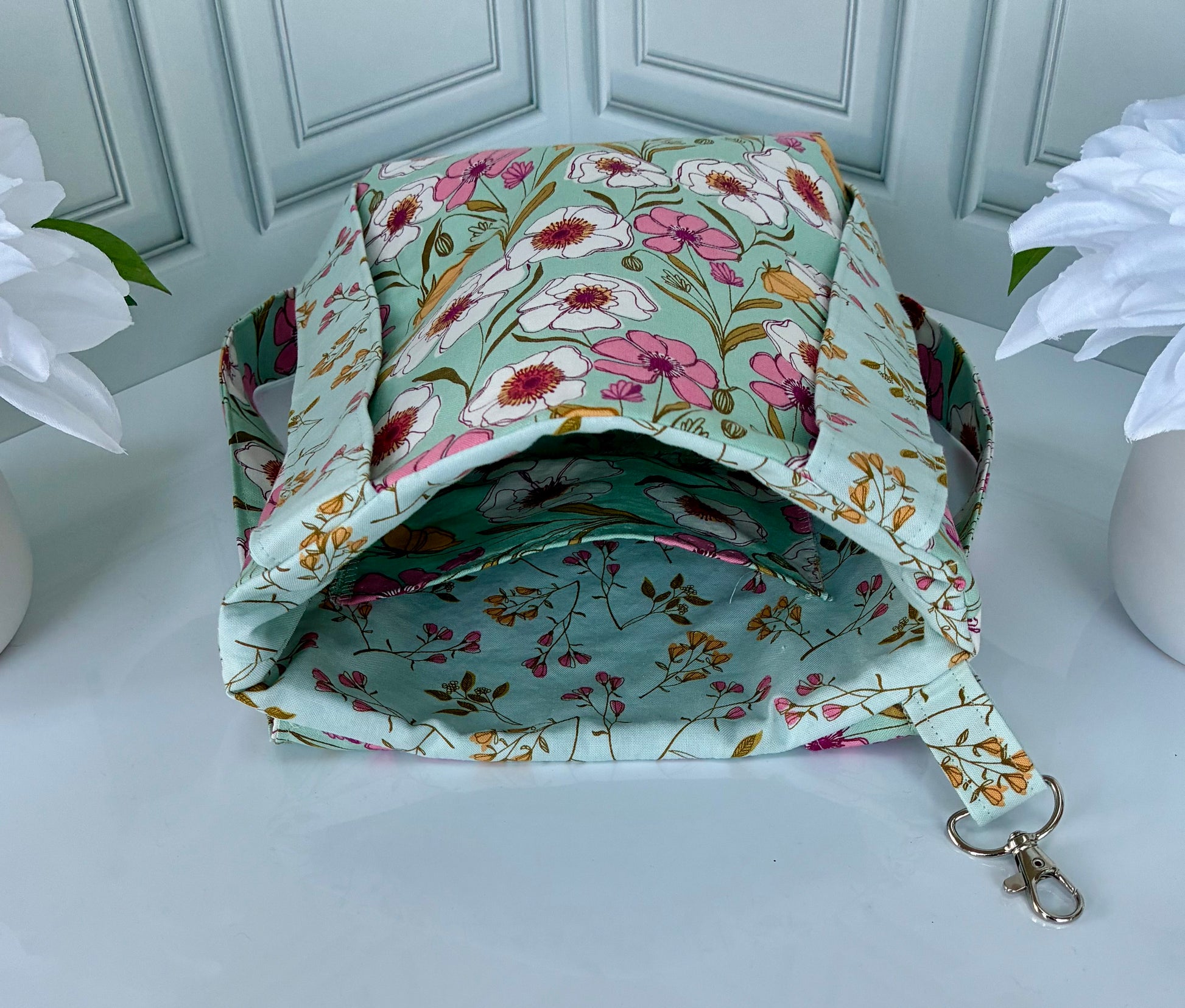 Measuring approximately 9"x10"x3”, a 14" strap drop with a strap on both sides, it's lightly padded for structure and softness. It has a generous interior pocket that's also lightly padded to provide a cozy cocoon for you phone or other important essentials. This bag is also great for your little one's favorite toys, dolls and plushies! This bag also features an attached key fob which can hold anything with a ring.