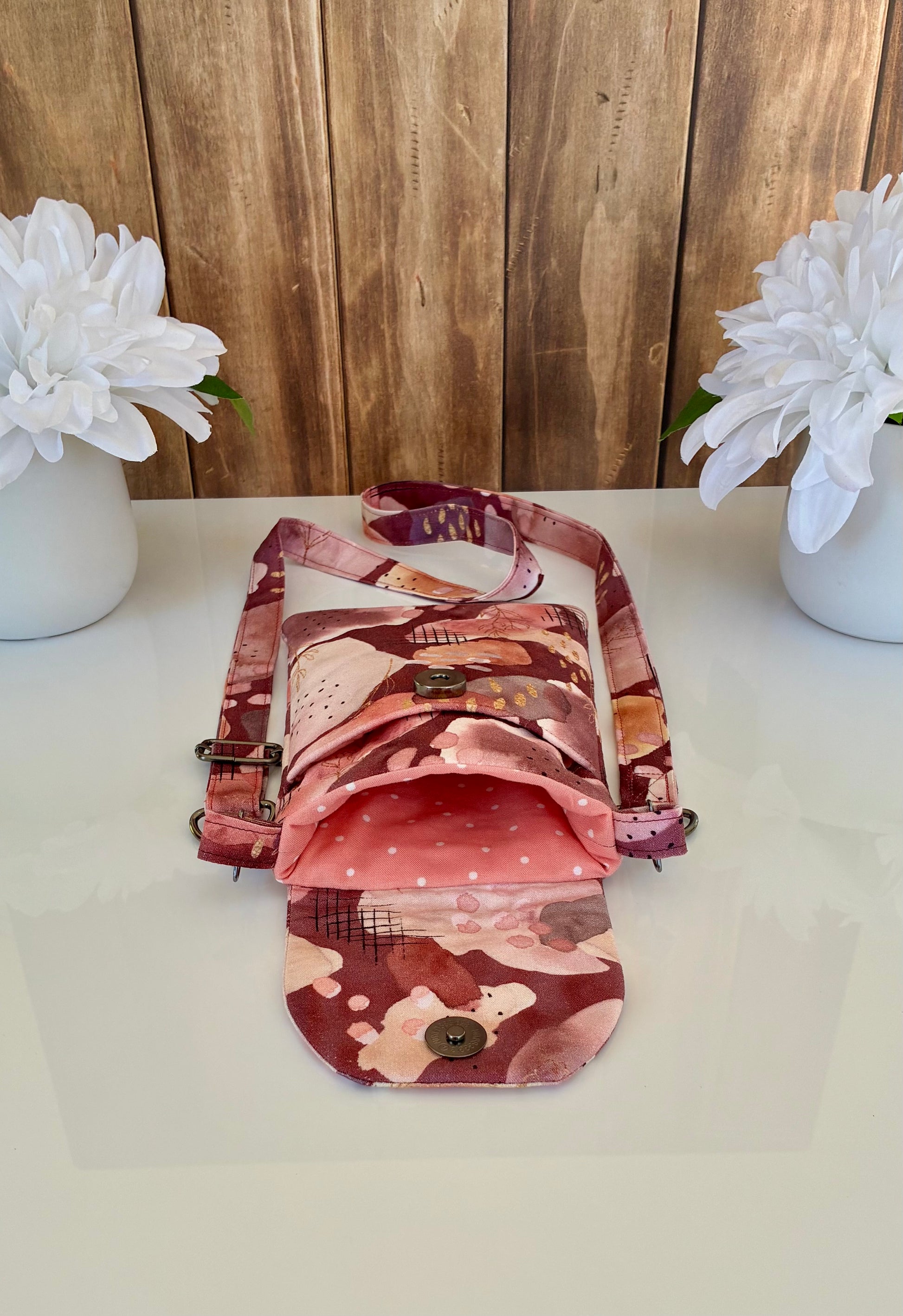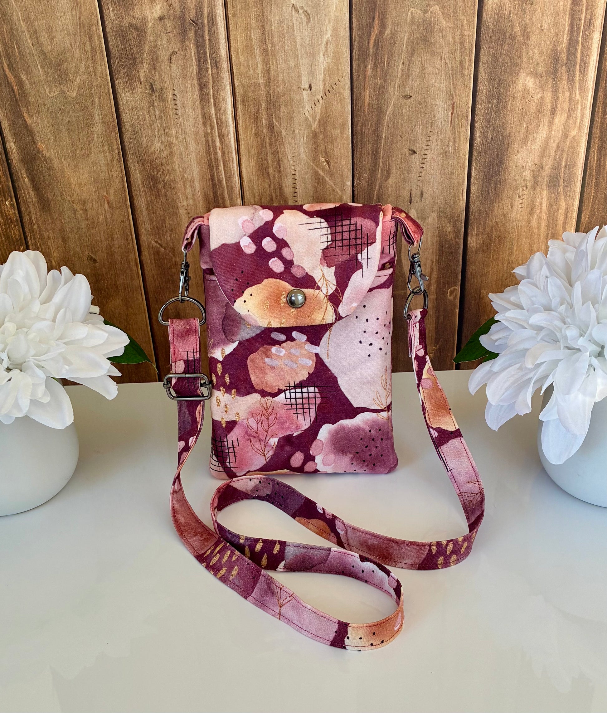 This soft, painterly crossbody feels like carrying a tiny piece of modern art. Slightly padded, it's a cozy cocoon for your phone and other small personal items. Blended rose, mauve, and burgundy tones create an organic, abstract pattern with delicate gold accents. Lightweight, comfortable, and beautifully structured, it’s the perfect grab-and-go piece for errands, travel, or days when you just want something pretty and easy. Measurements: approx 5"x8"x0.5", Removable and adjustable strap approx 36"
