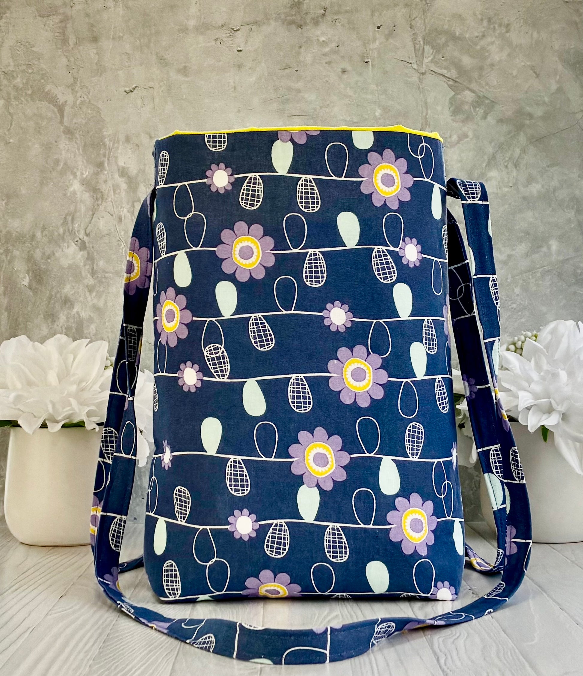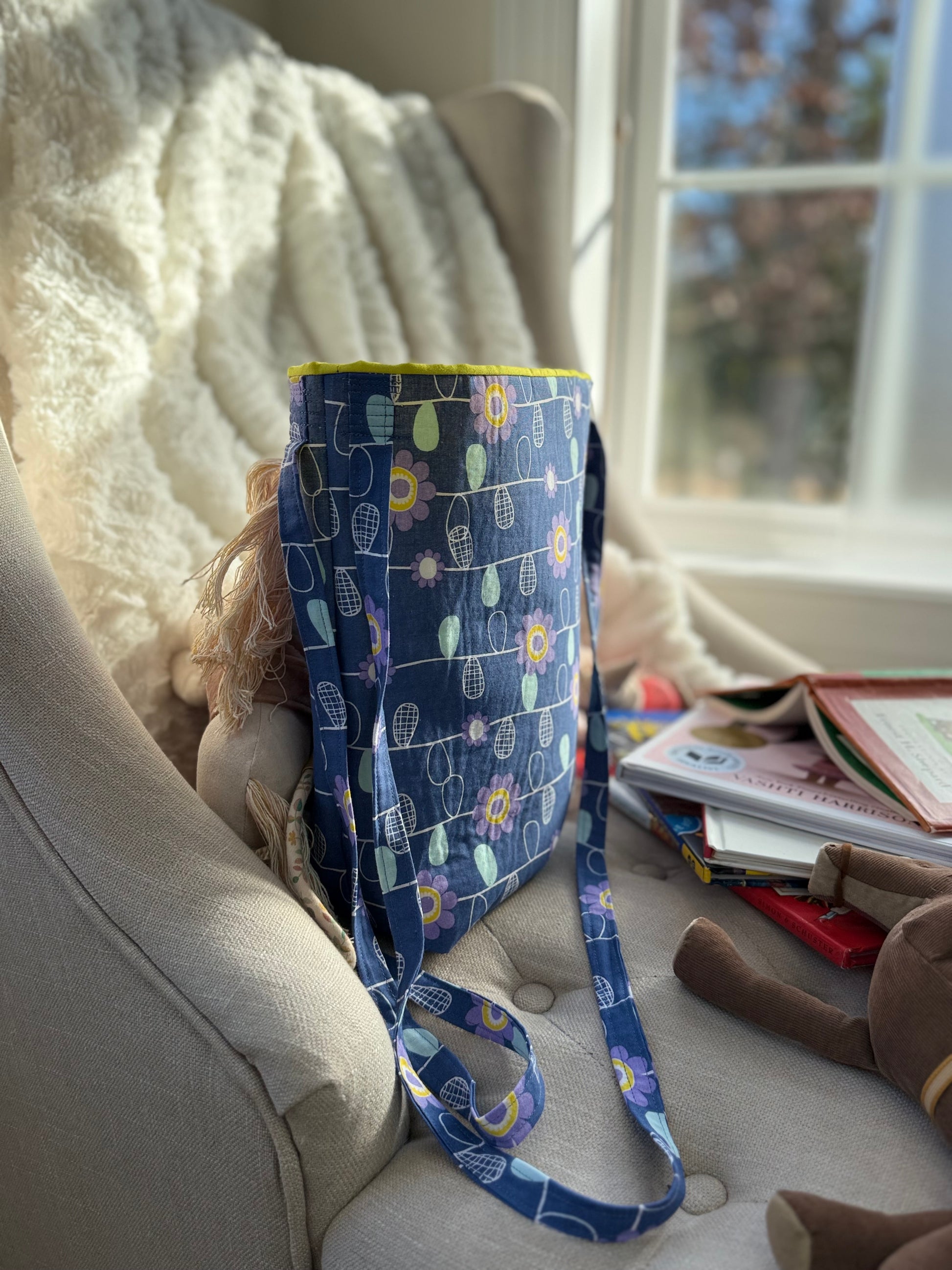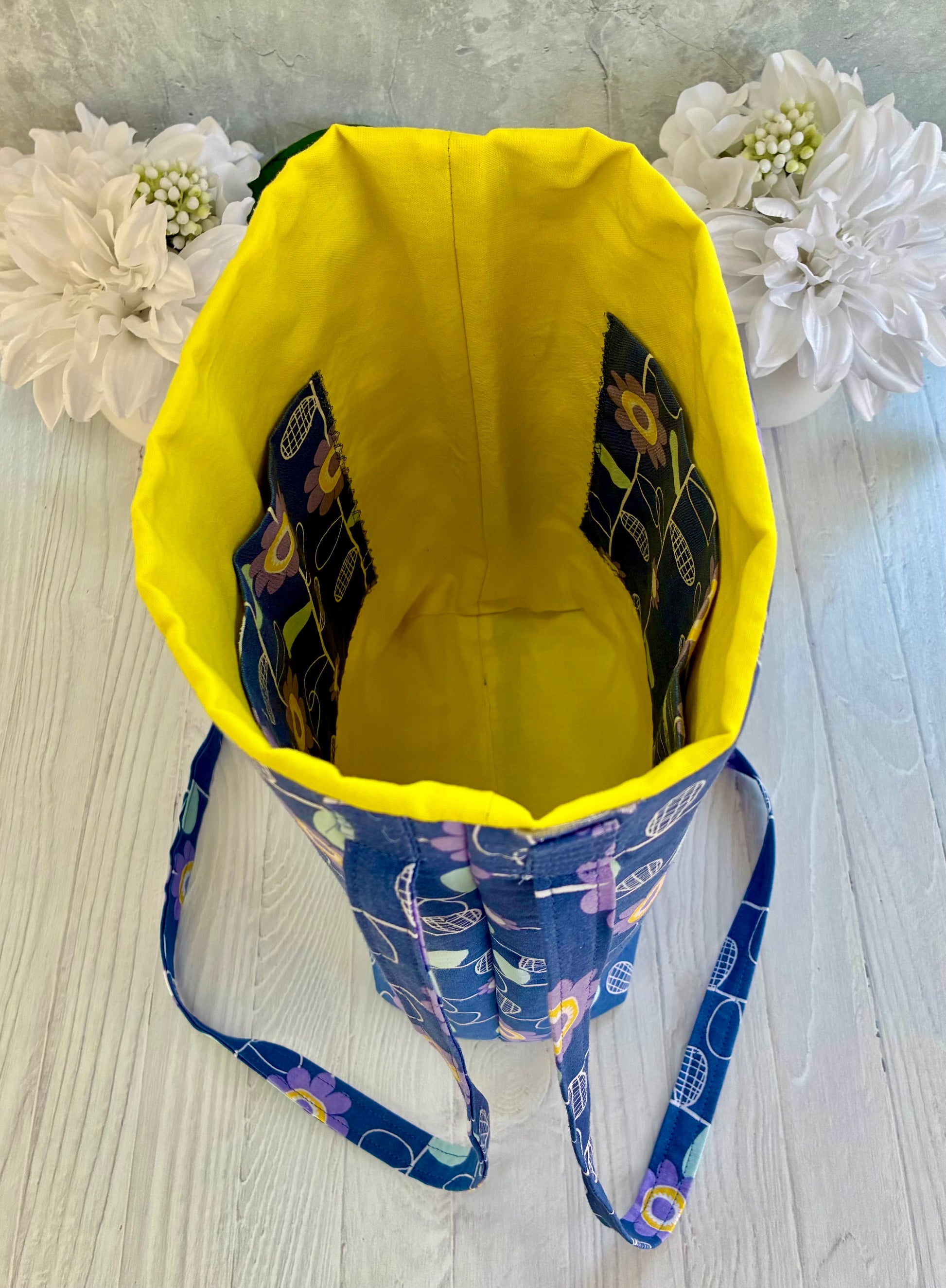 This blue-and-purple tote features a floral print and yellow lining. It's the kind of bag that's perfect for errands, day trips, and everything in between. It's also perfect for your little one's toys, plushies and dolls, and any other daily necessities. Lightly lined for structure and softness. Measurements- approx 10.5" x 12" x 4", strap drop approx 17", one strap on each side of bag. Two interior pockets, one with two separate compartments.