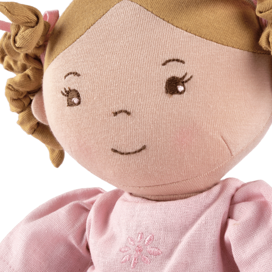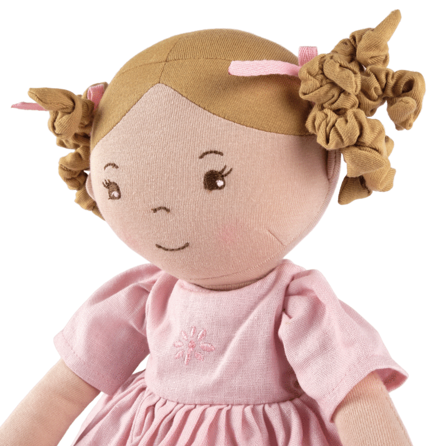 Amelia is a soft doll toy and is wearing a beautiful pink all-natural linen pink dress with matching shoes, stripy pink tights, and pink hair ribbons. Amelia's dress is removable for easy cleaning or you could dress her up in a different outfit for a special occasion. Included is our Bonikka Doll box to make it a beautiful presentation. Size: 16.5 in Age Recommendation: 0+ months Item Number: 51653 Features: Soft body doll with plush hair and embroidered facial features.