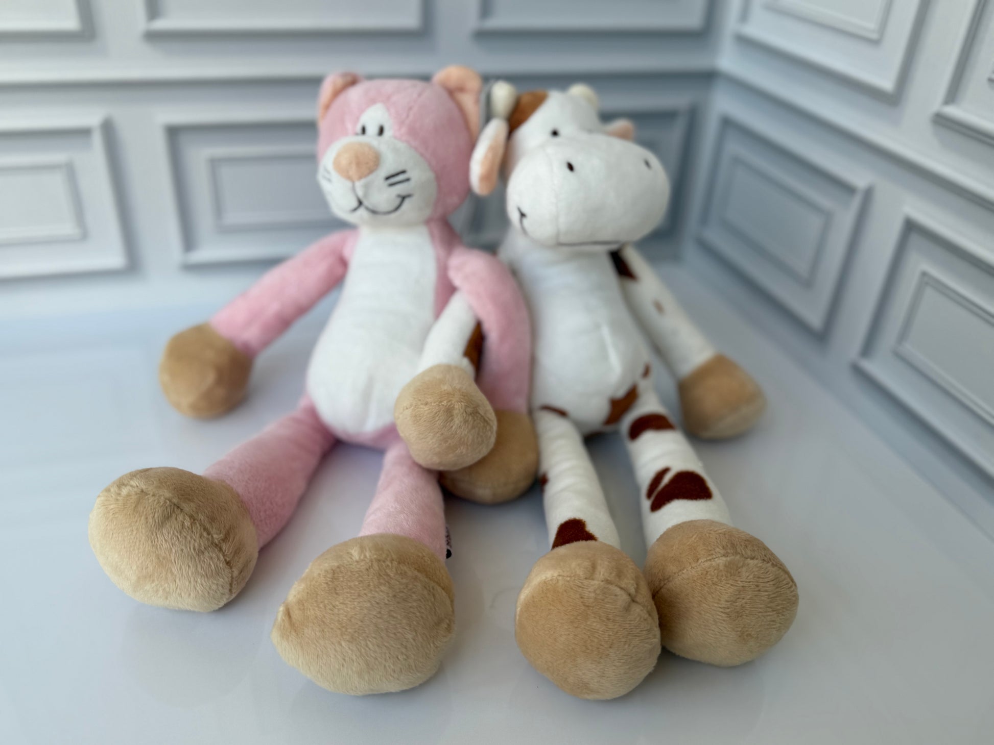 This lovable cow is super soft! Cow is a cozy cuddle friend with long arms, and legs. With a weighted bottom that allows it to sit upright, it's sure to be a favorite toy. Cleaning: Machine wash cold, delicate cycle and air dry. Do not tumble dry. Do not dry clean. For best results, hand wash.